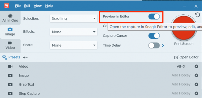 1、在Snagit的界面中,先打开“Preview in editor”选项,这是自动打开Snagit编辑窗口的选项,完成截图之后,Snagit会将截图同步到编辑窗口中。